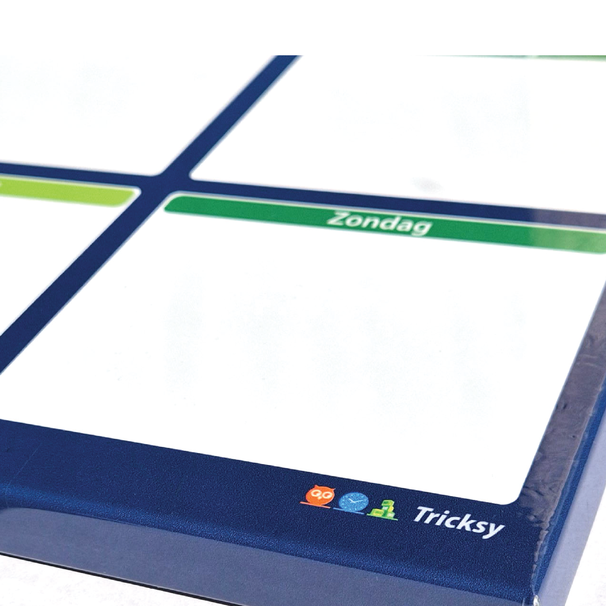 Het ontwerp van deze maandplanner is gebaseerd op het ontwerp van het planbord Blauwe Ster in combinatie met onze magneetsetjes 'dagen van de week'. Het planbord heeft een formaat van 90 x 60 x 2 waarbij de bedrukking doorloopt over de zijkant van het bord. De dagen hebben verschillende kleuren (volgens de schatkismethode) en er zijn geen data op het bord opgenomen zodat de maand flexibel is in te delen met bijvoorbeeld onze magneetjes maanddagen, maanden en tijden (bord is exclusief magneetjes!).